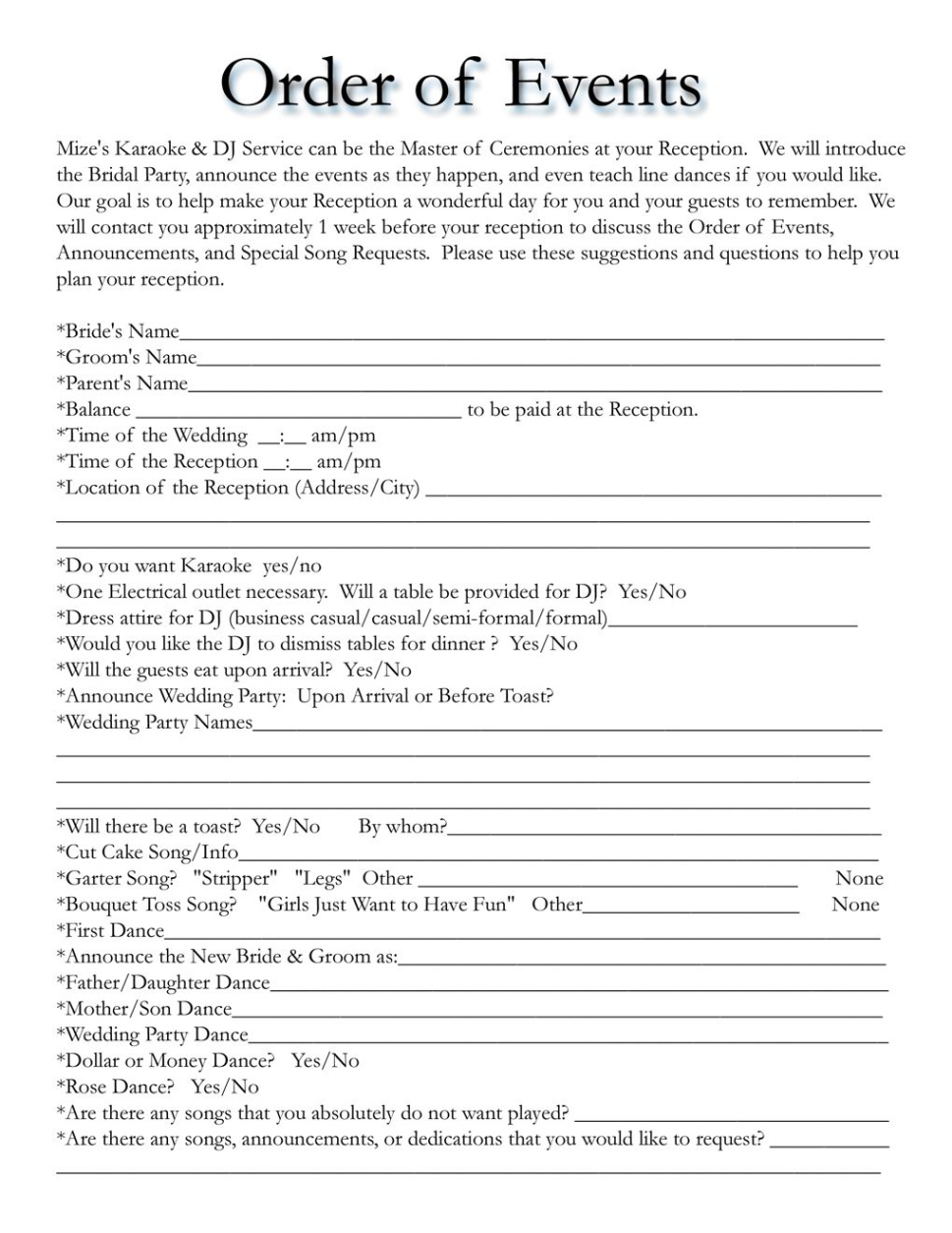 List of Gay Wedding Reception Timeline Template